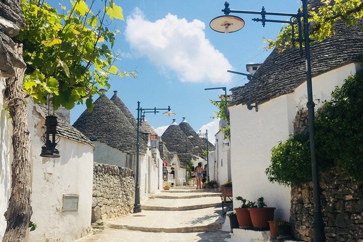 Visitare la stupenda Alberobello è come fare un viaggio in un paese senza tempo. Avrete del tempo a vostra disposizione per esplorare il suo caratteristico centro storico, riconosciuto Patrimonio Mondiale dell’Umanità nel 1996. Esso è integralmente costituito da Trulli, particolari edifici bianchi di forma piramidale che lo rendono unico al mondo e rappresentano uno degli esempi più straordinari di architettura popolare italiana. Particolarmente suggestivi sono: il quartiere "Rione Monti" ricco di negozietti e botteghe di artigiani e il quartiere "Aia Piccola", con i suoi trulli secolari e i piccoli musei di civiltà contadina.